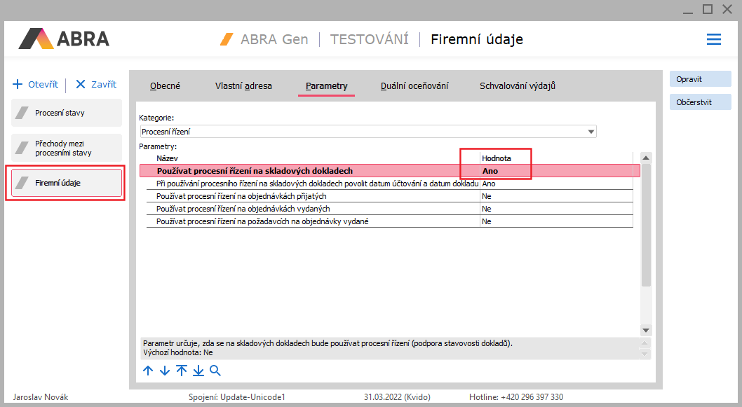 Otevřeme si agendu Firemní údaje. Najdeme volbu Skladové doklady (používat procesní řízení).Viz záložka Parametry → kategorie Procesní řízení. Vyvoláme funkci Opravit, nastavíme volbu na hodnotu Ano a uložíme: