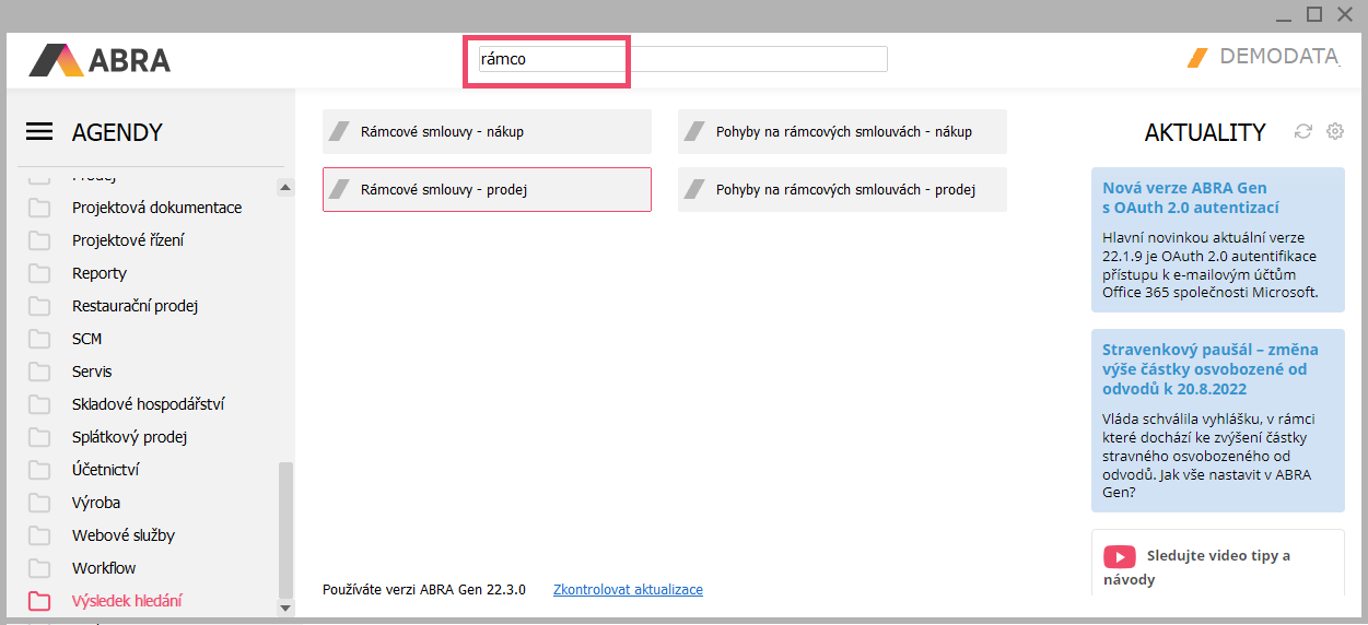 Cesta k agendě Rámcové smlouvy - prodej a Rámcové smlouvy - nákup. Agendu můžeme i rychle dohledat zadáním části jejího názvu.