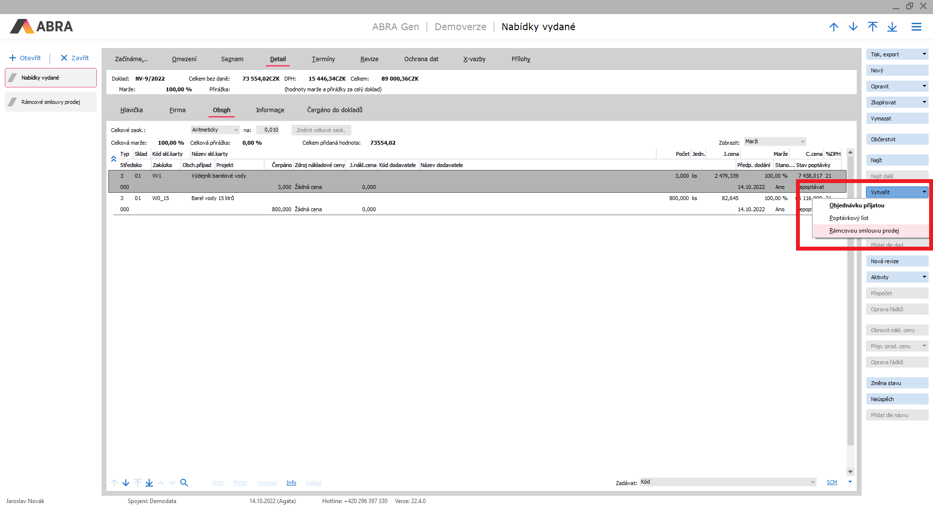 Prvotní doklad Nabídka vydaná. Z ní můžeme vytvořit doklad Rámcová smlouva - prodej.