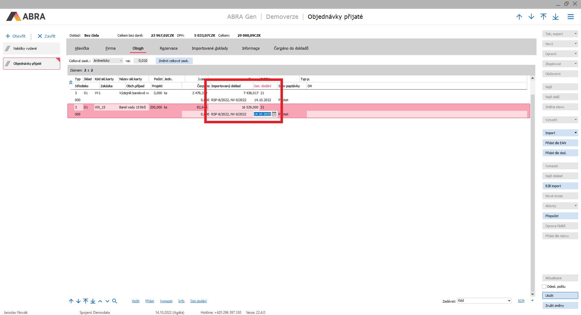 V obsahu nově vytvořené Objednávky přijaté můžeme v řádcích vidět přenesené datum dodání a přehled o importovaných dokladech.