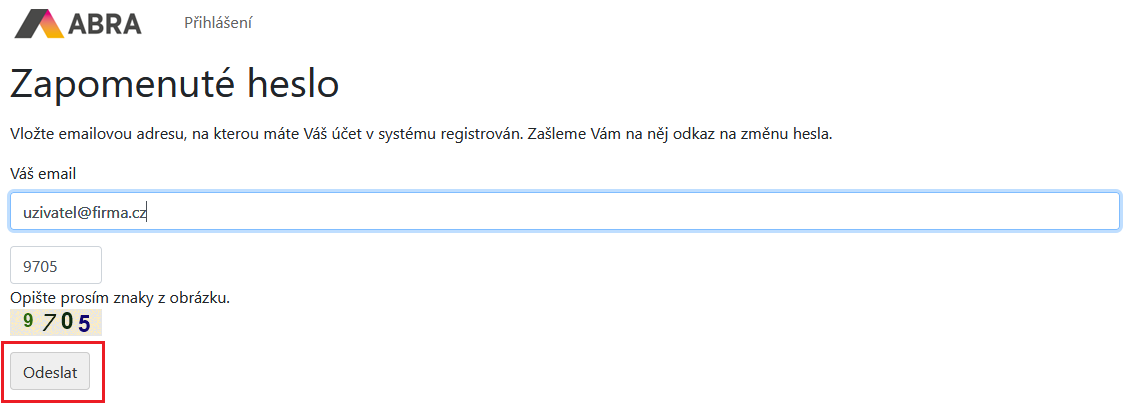 Vložte e-mailovou adresu, kterou jste zadali při aktivaci v kroku 1, opište znaky z obrázku a stiskněte tlačítko Odeslat. Na e-mail vám zašleme přihlašovací jméno a odkaz pro změnu hesla.