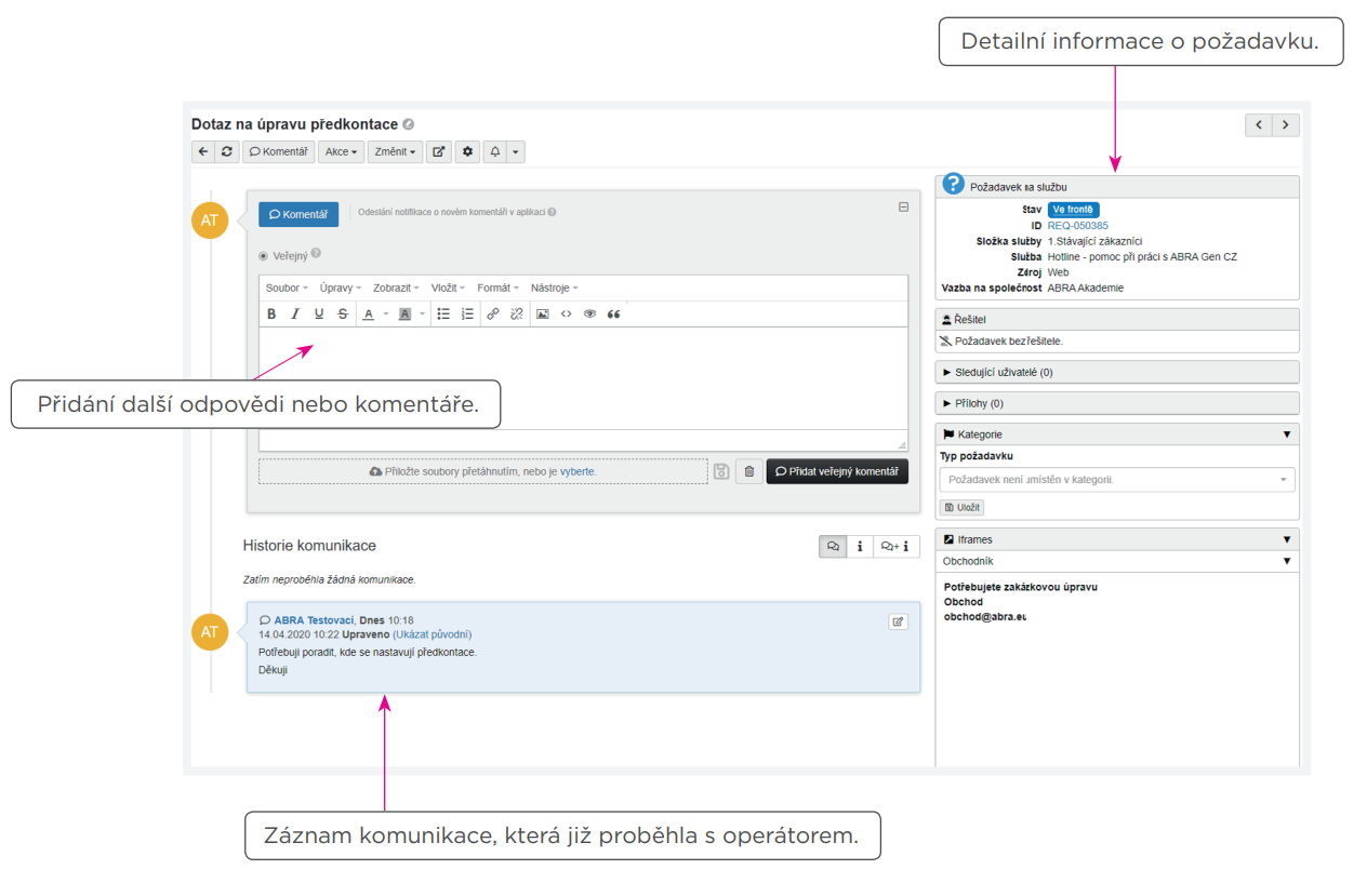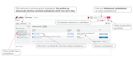 Po odeslání můžete sledovat průběh řešení vašeho požadavku na záložce Požadavky. Jaké operace a jaké členění požadavků máte k dispozici, je domluvené v rámci vaší společnosti.