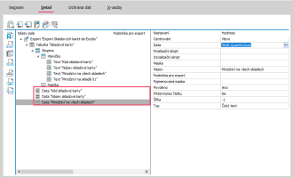 V dalším kroku již přidáme datové položky, a to buď jako text z databáze, nebo výrazem. Tam, kde nepotřebujeme používat funkce, nám bude stačit Text z databáze. Ten použijeme pro Kód a Název skladové karty.