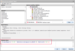 Budeme-li chtít formátovat sloupec s množstvím na skladě 01 na dvě desetinná místa, použijeme funkci FormatNumeric. V této funkci zadáme nejprve v prvním parametru masku, tedy jak budeme chtít formátovat (maska se zadává jako řetězec, tedy do apostrofů) a druhý parametr bude formátované číslo. Celý výraz bude vypadat následovně: