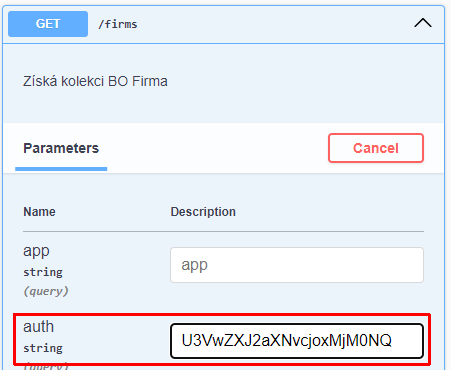 Ve Swagger UI můžeme API dotaz i vyzkoušet. K tomu budeme potřebovat autentizační údaje zakódované do base64 pro parametr auth. Jak postupovat viz Query parametr auth.