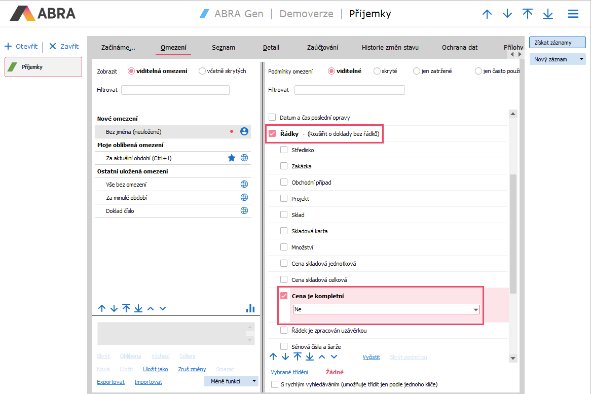 Doklady s nekompletními ceny prověříme v agendě Příjemky, kdy si na záložce Omezení nastavíme podmínku Řádky, kde zvolíme u položky "Cena je kompletní" hodnotu Ne. Poté na získaných záznamech situaci napravíme.
