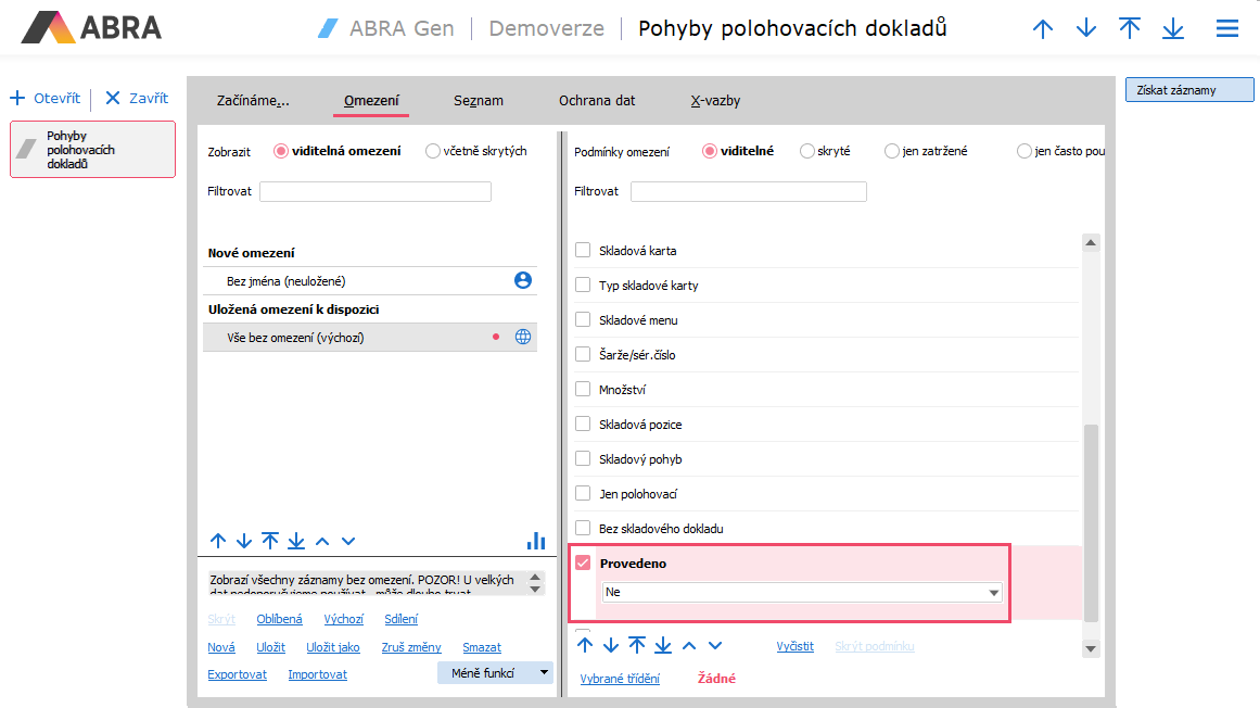 Kontrolu provedeme v agendě Pohyby polohovacích dokladů. Na záložce Omezení nastavíme podmínku Provedeno na hodnotu "Ne". Případně můžeme záznamy omezit také za Datum vystavení dokladu, kdy zde nastavíme požadované období. Na získaných záznamech provedeme polohování.