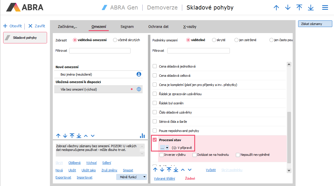 Pro kontrolu použijeme agendu Skladové pohyby, kde na záložce Omezení nastavíme podmínku Procesní stav na hodnotu "V přípravě". Na nalezených dokladech poté musíme stav změnit.