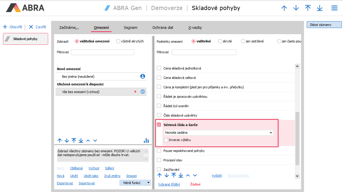 Potřebujeme tedy ověřit, zda jsou sériová čísla/šarže zcela zadána. Kontrolu provedeme v agendě Skladové pohyby, kdy na záložce Omezení nastavíme podmínku Sériová čísla a šarže na hodnotu "Nezcela zadána", případně můžeme záznamy omezit také za Datum vystavení dokladu, kdy zde nastavíme požadované období. Na získaných záznamech doplníme chybějící sériová čísla/šarže.