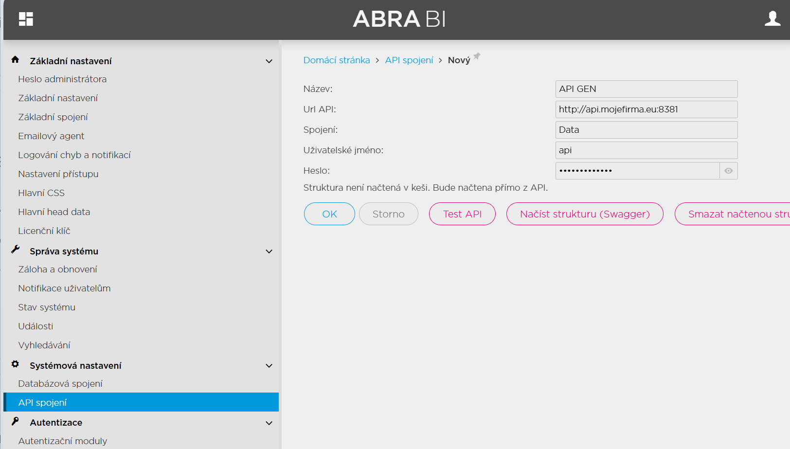 V administraci ABRA BI přejděte do agendy Systémová nastavení → API spojení a pomocí tlačítka "Nový" založte nové spojení. Tímto krokem říkáte systému ABRA BI, kde se nachází váš aplikační server ABRA Gen a jak se k němu má připojit.