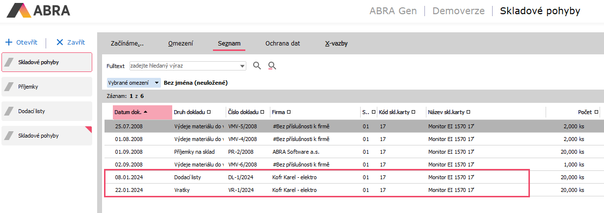Zobrazený seznam obsahuje informace o dokladu, na kterém se nachází skladový pohyb, dále pak sklad a skladová karta. Díky tomu můžeme pokračovat v pátrání po tom, proč se skladový pohyb neuzavřel.