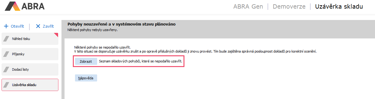 Tento návod provází chybou uzávěrky skladu typu "K datu". Při uzávěrce skladu za období se zobrazení tohoto seznamu nenabídne.