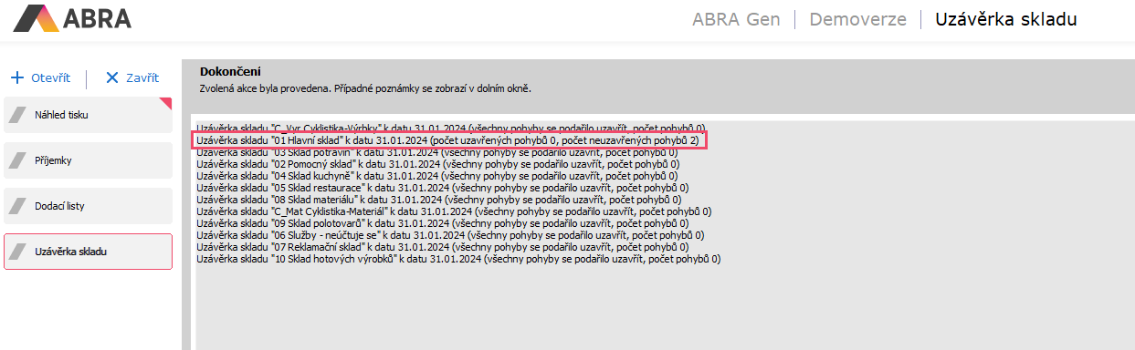 Jak jsme psali výše, i přes všechny předem provedené kontroly může po proběhnutí skladové uzávěrky nastat situace, kdy se většinu skladů podaří uzavřít, a třeba se podaří uzavřít i všechny sklady, ale nepodaří se uzavřít a tedy i ocenit některé ze skladových pohybů. Hlášení skladové uzávěrky může vypadat např. takto: