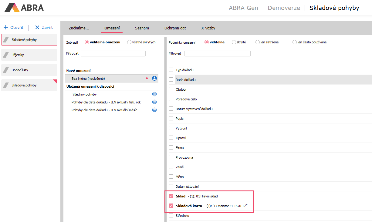 Abychom mohli situaci objasnit a zjistit, kdy mezi skladovými pohyby nastal nesoulad (skladová karta se dostala do záporného stavu), otevřeme si agendu Skladové pohyby a nastavíme na záložce Omezení podmínky za Sklad a za Skladovou kartu, pro kterou chceme skladové pohyby vyřešit.