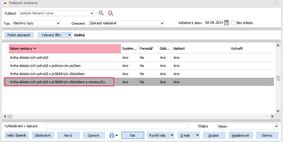 Abychom rozklíčovali, co se přesně stalo a kdy se skladová karta dostala do záporného stavu, použijeme pro přehlednost nad všemi získanými záznamy tiskovou sestavu Kniha skladových pohybů s průběžným zůstatkem a mezisoučty.