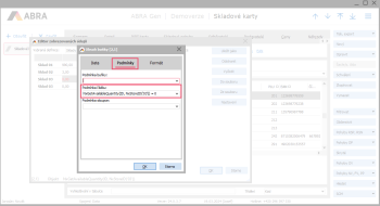 Nyní do čtvrtého řádku přidáme podmínku, aby se řádek zobrazoval jen v případě, že bude množství na skladě vyšší než nula. Můžeme si zkopírovat opět přes klávesovou zkratku ctrl+C podmínku ze třetího řádku, záložky Podmínky.