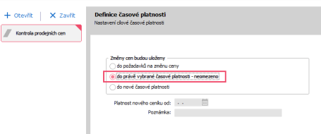 Po nastavení nových cen nad marži 20% ještě nastavíme definici platnosti. V našem případě jsme změnu ceny rovnou zařadili do ceníku s neomezenou platností.