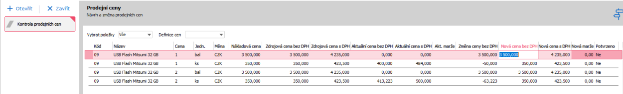 Každou nově nastavenou cenu musíme potvrdit. A to buď jednotlivě nebo všechny ceny ve filtru. Ve sloupci Potvrzeno musí být nastavena hodnota Ano.