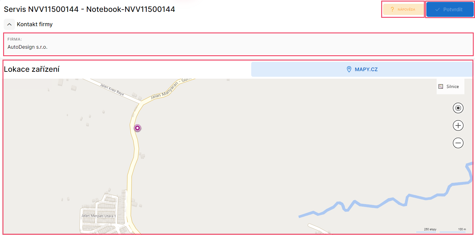 Zobrazují se zde pouze informace k firmě, které jsou vyplněné a které se liší od základních vyplněných údajů v Adresáři firem. Tedy např. pokud je adresa provádění servisu stejná jako adresa sídla firmy, pak se zde adresa firmy nezobrazí. Pokud je ovšem nastavena adresa firmy, kde se servis provádí, a tato adresa se liší od firmy, která se na dokladech uvádí jako plátce, pak se zde zobrazí adresa firmy prováděného servisu. Adresa se zde tedy zobrazuje vždy ta nejpřesnější, jakou lze nabídnout. Místo servisu lze vidět také přímo v mapě.
