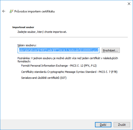 V rámci EET je potřeba se odkazovat na příslušný certifikát. Certifikát může být variantně uložen do Windows nebo přímo do ABRA Gen. Je-li v agendě Nastavení EET nastaveno jako úložiště certifikátu = Windows, je nutné provést instalaci certifikátu na každý počítač a server, ze kterého se budou tržby odesílat (tím pádem i podepisovat). V případě, že je jako úložiště certifikátu nastaveno do ABRA Gen, není nutné tyto instalace certifikátu na jednotlivé počítače provádět . Příklad modelového postupu instalace certifikátu. Konkrétní postup se může na různých platformách drobně lišit. |