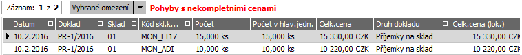 Pokud si je zobrazíme, zjistíme, že se jedná o pohyby na příjemce PR-1/2016, kterou jsme si zadali s nekompletními cenami v kap. Příjem na sklad - tuzemský obchod: