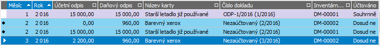 Záznamy odpisů za první tři měsíce jsou již zaúčtované, všechny další záznamy odpisů jsou zatím Nezaúčtované. Kartu DM-00003 jsme zařadili až v červnu, tudíž záznamy jejích odpisů začínají až od 6/2016.