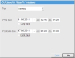 Po stisku tlačítka Lékař / Nemoc Nejprve zvolte typ záznamu v položce Typ. Následně zadejte datum prvního dne a čas trvání od-do v tento den. Případně použijte volbu Celý den a tím není nutné zadávat čas od-do pro první den. Trvá-li Nemoc více dnů, uveďte konečný den do položky datum posledního dne. Tím se zpřístupní časy od, do pro tento poslední den a můžete je nastavit. Případně použijte volbu Celý den.