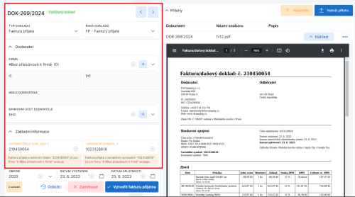 Červená barva je chyba zásadní, kterou je nutné opravit před uložením dokladu, jinak není možné doklad uložit. Tlačítko Vytvořit fakturu přijatou není aktivní.