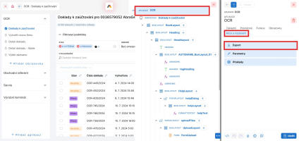 V následující obrazovce je možné vybrat obrazovky, které chcete z aplikace exportovat. Ve výchozím stavu jsou vybrány všechny obrazovky. Kromě obrazovek jsou zde vidět informace o verzi aplikace, jejím názvu, kódu atd. Tlačítkem Vyexportovat dojde k exportu aplikace a uložení souboru s názvem aplikace. Soubor je ve formátu JSON. Export je bez uživatelských parametrů (v budoucnu bude možné zvolit, zda se mají také exportovat).