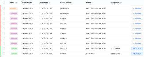 Pro snadné rozlišení kvality vytěžení jsou jednotlivé doklady označeny vlevo barvami, viz obrázek níže. Význam jednotlivých barev popíšeme dále v textu.