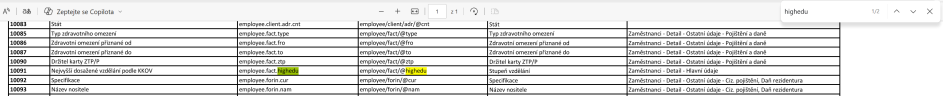Postup: Zkopírujete řetězec v apostrofech před slovem attribute, v tomto příkladu highedu. V dokumentu Registrace zaměstnanců - řešení chyb použijte Ctrl+F, vložte zkopírovaný atribut a dejte tento řetězec vyhledat. Zjistíte tak, v jaké agendě, na jaké záložce a v jakém formuláři se položka nachází a jak se jmenuje. Položku opravte.
