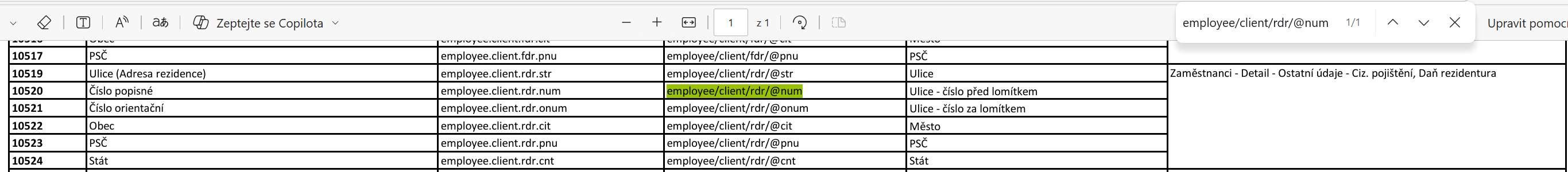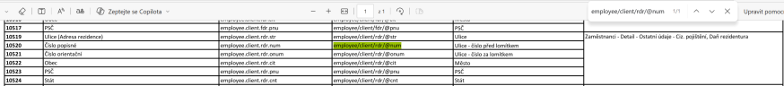 Postup: Zkopírujete např. řetězec employee/client/rdr/@num. V dokumentu Registrace zaměstnanců - řešení chyb použijte Ctrl+F, vložte zkopírovaný atribut a dejte tento řetězec vyhledat. Zjistíte tak, v jaké agendě, na jaké záložce a v jakém formuláři se položka nachází a jak se jmenuje. Položku opravte. |