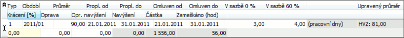 Typ řádku je 1, tj. proplacení a nepřítomnost. Tj. zaměstnanec bude omluven do 31.01.2011 a současně mu bude nemocenská vyplacena za dny nemoci do 31.1. Nicméně dávka je stále neuzavřena a bude pokračovat do dalšího měsíce. Při výpočtu vyplácené částky se vychází z průměru na dovolenou upraveného dle platných zákonů. První tři pracovní dny nemoci se neproplácí, pak se proplácí 60% z upraveného průměru za každou hodinu, která by byla odpracována, pokud by zaměstnanec nebyl nemocný, tj. v našem případě 4 dny x 8 hodin x 0,6 x 81 Kč = 1555,2 Kč, po zaokrouhlení 1556 Kč.