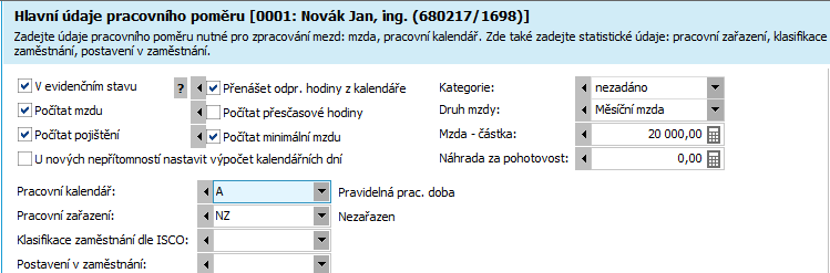 Zde zadáme především typ pracovního poměru, dobu nástupu, středisko atd.