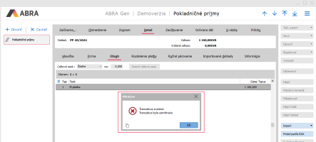 Pokud platební transakce neproběhla, doklad bude mít zatržen příznak Elektronická platba, ale položka Elektronická platba provedena bude nevyplněna. V takovém případě lze transakci zopakovat pomocí tlačítka Platební terminál, které se v tomto případě u daného dokladu zpřístupní. Pokud by neproběhla ani fiskalizace, nebyla by vyplněna ani položka Způsob fiskalizace. V takovém případě lze fiskalizaci zopakovat pomocí tlačítka Fiskalizace, které se v tomto případě u daného dokladu rovněž zpřístupní.