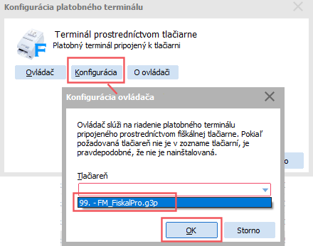 Po výběru správného ovladače se zpřístupní tlačítko Konfigurace. V konfiguraci ovladače se přiřazuje konkrétní zařízení. Zde vybereme z nabídky ovladač přes fiskální tiskárnu: