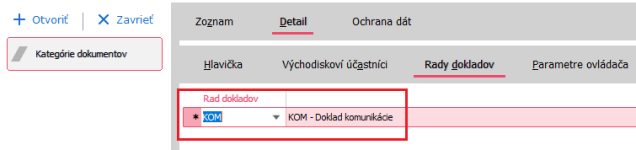 Ke kategoriím dokumentů Definovatelný import a Definovatelný export na subzáložce Řada dokladů přiřaďte pouze jednu řadu dokladů. (např. Doklad komunikace KOM).