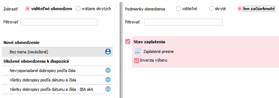 Podobný výsledok môžeme dosiahnuť i bez nutnosti vytvárať vzájomný zápočet. V obmedzení je možné použiť inú podmienku Stav vysporiadania: