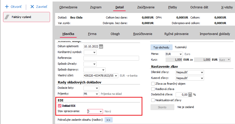 Ak je aktívna licencia EDI komunikace, sú na hlavičke vyššie spomenutých dokladov povolené polia pre EDI. Stav spracovania Nový značí, že ide o doklad, ktorý ešte nebol v rámci EDI komunikace odoslaný.