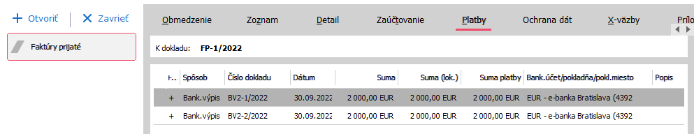 Faktúru prijatú sme omylom zaplatili dvakrát. Máme teda na záložke Platby pripojené dve platby bankovým výpisom.