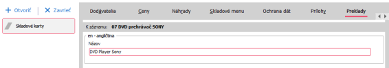 Z číselníka skladových kariet vyberieme záznam, pri ktorom budeme chcieť vykonať preklad. Následne na záložke Preklady vyplníme anglický názov pre vybranú skladovú kartu.