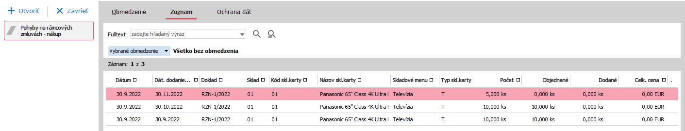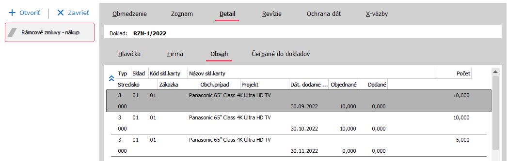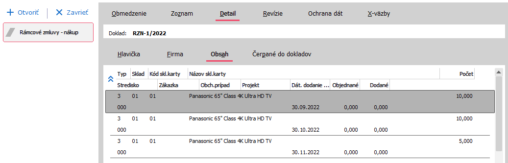 Na obrázku máme vytvorenú Rámcovú zmluvu – nákup na jednu skladovú kartu s troma rôznymi dátumami dodania. V stĺpci objednaných je zatiaľ 0, to znamená, že nebola vytvorená žiadna Objednávka vydaná u dodávateľa.