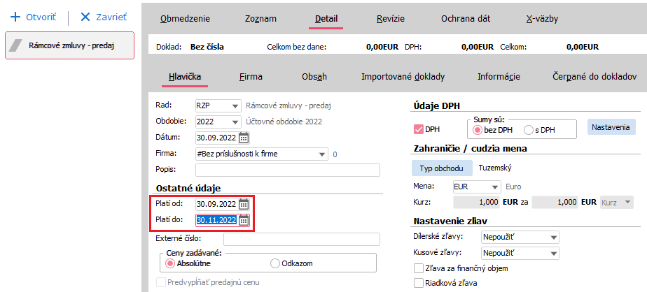 Na hlavičke dokladu sú dve polia „Platí od“ a „Platí do“, ktorými určujeme rozsah platnosti Rámcovej zmluvy. Rovnaké pole nájdeme i v agende Rámcové zmluvy - nákup.