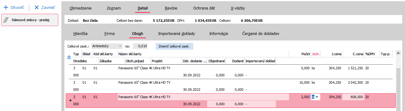 V obsahu dokladu Rámcová zmluva - predaj zadáme jednotlivé riadky tak, ako ich bude chcieť zákazník čerpať. V našom prípade sme rozdelili objednávku na 17 kusov na tri rôzne termíny.