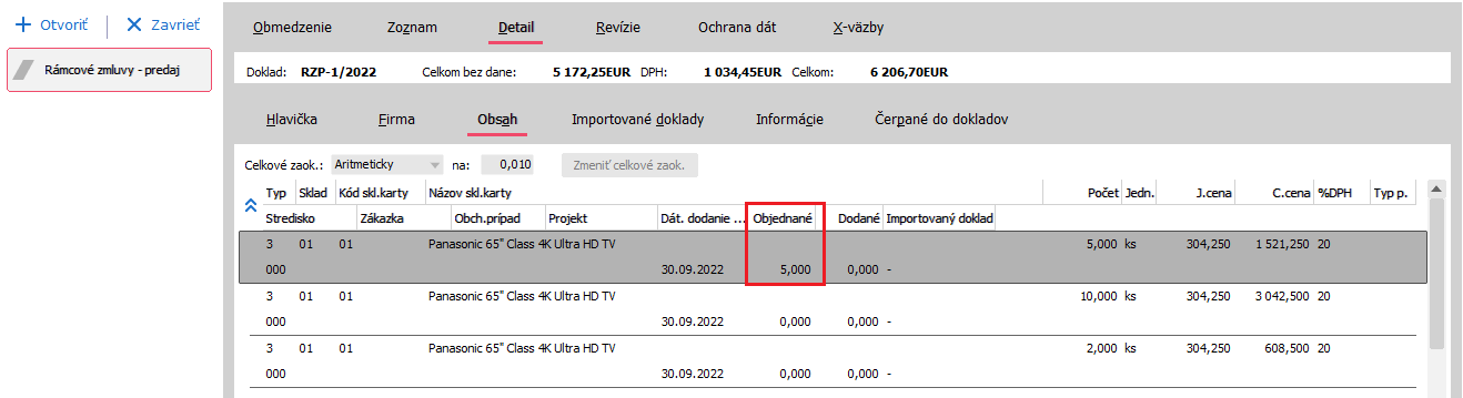 Po vyexpedovaní vytvorenej Objednávky prijatej opäť vidíme v obsahu dokladu Rámcová zmluva - predaj, že bolo určité množstvo dodané.