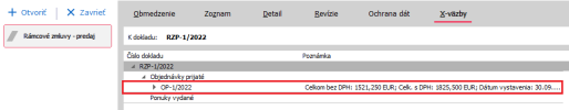 Po vytvorení prvej Objednávky prijatej z Rámcovej zmluvy - predaj vidíme na riadku dokladu Rámcová zmluva, že vznikla objednávka na prvý termín.