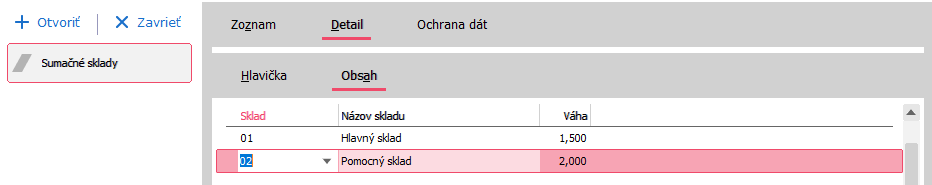 V agende Sumačné sklady vyberieme sklady, ktoré majú byť súčasťou jedného sumačného skladu, a pridelíme váhu.