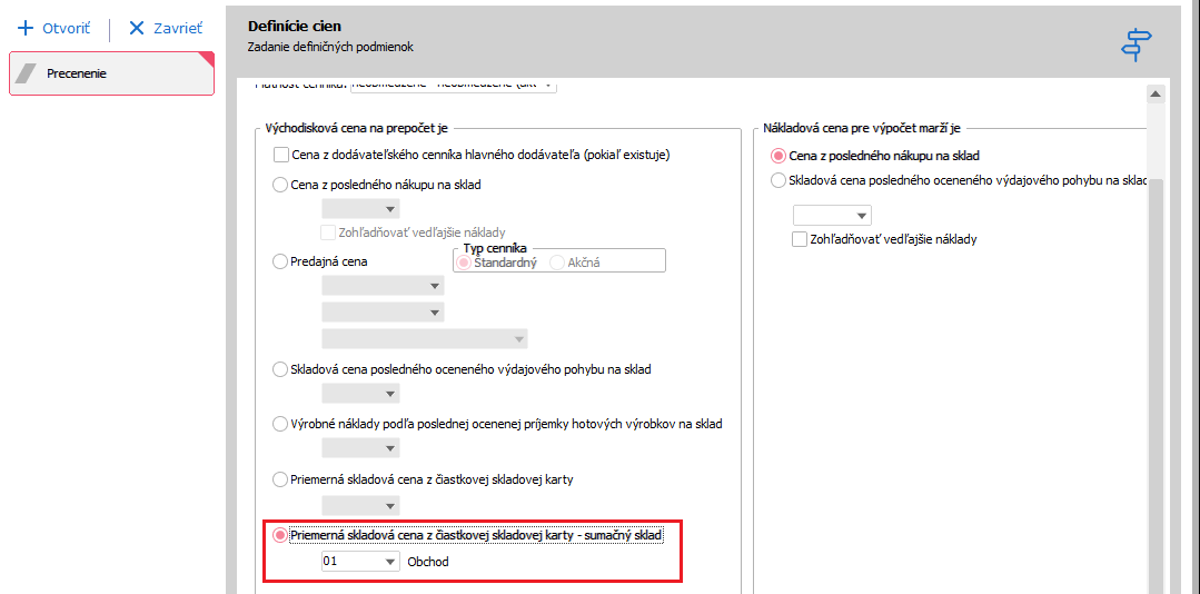 V agendách Cenníky resp. Akčné cenníky v rámci Sprievodcu precenením potom vyberieme metódu precenenia s východiskovou cenou pre prepočet Priemerná skladová cena z čiastkovej skladovej karty – sumačný sklad. Podmienkou pre správne fungovanie je, aby na čiastkovej skladovej karte bola priemerná cena uvedená.