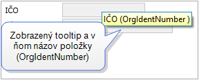Ak sa chcete uistiť, o akú položku v danom formulári ide (nie ste si z jej pomenovania v danom formulári istí), tak si môžete jej názov zobraziť pomocou tooltipu alebo priamo v definícii formulára. Viď tiež Možnosti zobrazenia názvu položky v def. vstupnom formulári a Možnosti zobrazenia názvu položky vo var. formulári.