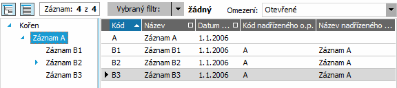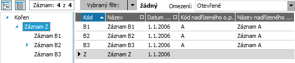 ukazovateľ vpravo v zozname stojí vždy na zázname zodpovedajúcom aktuálnej vetve stromu bez ohľadu na to, že v tomto prípade máme namiesto záznamu s kódom A záznam s kódom Z a pri triedení podľa kódu je tento záznam Z v zozname vpravo posledný v poradí. Stlačením Enter sa teda vyberie záznam Z.